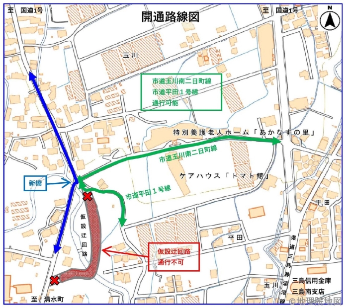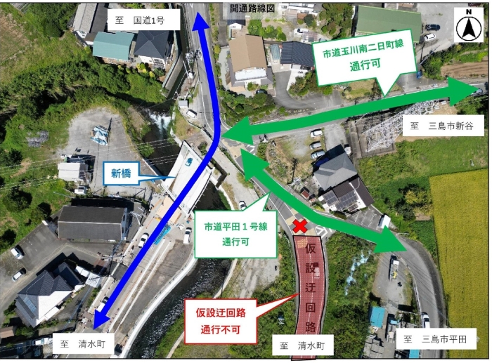 ・すでに開通している南北道路(青線)と三島市道(緑線)が新橋付近で接続し、通行が可能となります。