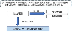 - 町立幼稚園の園区(各幼稚園の通園区域)については、再編に合わせて順次廃止するとともに、自動車による通園も可能とします。