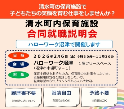 清水町内の保育施設(保育所・保育園)の職員確保を目的として、ハローワーク沼津で合同就職説明会を開催します。