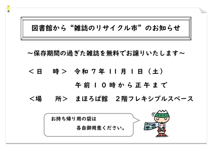 読書週間のイベントとして、雑誌のリサイクル市(無料配布)を開催いたします。